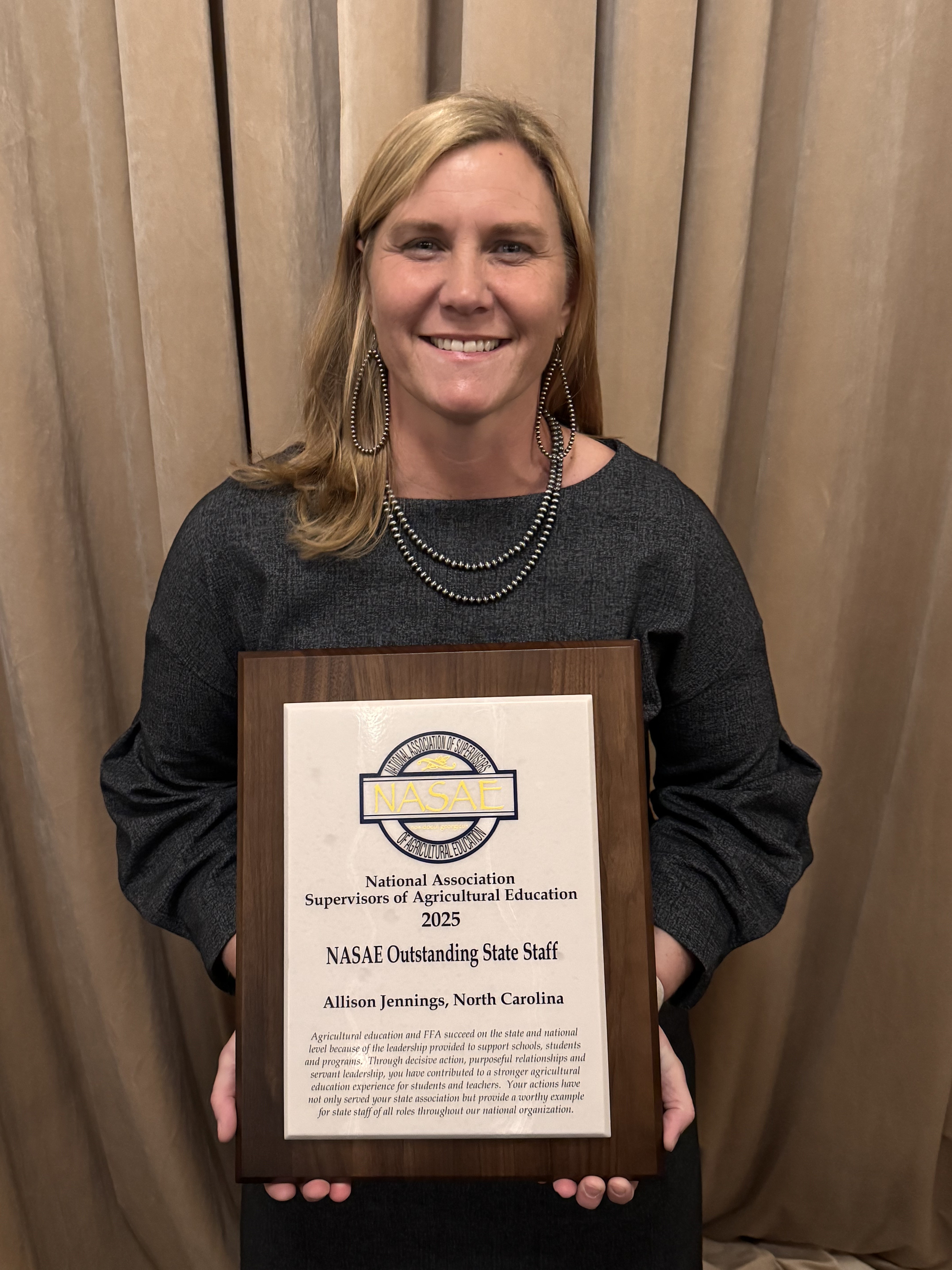 Allison Jennings, North Carolina FFA Eastern Region Agricultural Education Coordinator, received the NASAE Outstanding State Staff award. This award recognizes state staff members, including regional supervisors, foundation directors, and leadership coordinators.